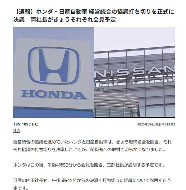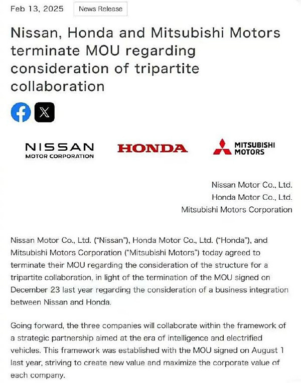 谁能想到,这合并谈判还没持续两个月,就宣告破裂。当地时间 2 月 13 日,日产、本田、三菱发布联合公告,同意终止关于考虑三方合作架构的谅解备忘录 ,本田和日产的合并计划彻底泡汤。那么问题来了,这好好的合并计划,为啥说黄就黄了呢?其实,在谈判过程中,双方的理念分歧越来越大。一开始,双方想通过共同出资成立控股公司,实现平等合作。但谈着谈着,本田提出想把日产变成全资子公司,这可打破了最初的设想,日产内部强烈反对。日产一直强调独立运营和全球布局,要是被本田子公司化,就得调整战略方向,这可不是日产想看到的。除了理念不合,本田给日产设立的利润目标也太严苛了。本田要求日产在 2026 财年把营业利润至少提升三倍,这对日产来说太难了。回顾日产近几年的财务状况,2024 财年营业利润预期才 1500 亿日元,2024 年第二财季营收下滑 5%,营业利润更是大跌 85%,还净亏损 93 亿日元。要在短短两年内实现营业利润至少三倍增长,日产压力山大。为了满足本田要求,日产制定了一系列复苏计划,像全球裁员 9000 人、削减 20% 全球产能、CEO 工资减半等。但这些措施在实施过程中困难重重,各地区反对声不断,裁员和削减产能进展滞后,这让本田对日产的复苏计划产生质疑,双方矛盾进一步加剧。其实,从一开始,很多业内人士就不看好本田和日产的合并。乘联会秘书长崔东树就说,两家公司在新能源技术发展上都比较迟缓,市场也在萎缩,当务之急是加速新能源技术创新,推出更具竞争力的产品。日产前 CEO 卡洛斯・戈恩也认为,这合并既是绝望之举也是孤注一掷。如今合并失败,日产又得重新寻找投资者,富士康旗下的鸿海集团成了潜在对象。2 月 12 日,鸿海董事长刘扬伟表示,鸿海是谈合作,不是并购,和日产、本田都是接触对象之一。虽然本田和日产合并谈判失败了,但未来它们在智能化和电动化车辆战略合作伙伴关系的框架内,还是会继续合作。对咱们消费者来说,可能更关心这对未来买车有啥影响。我觉得短期内,可能没啥大变化,但从长远看,这两家公司肯定会加快自身发展步伐,未来说不定会给我们带来更多更好的车型。大家觉得呢?欢迎在评论区留言讨论!